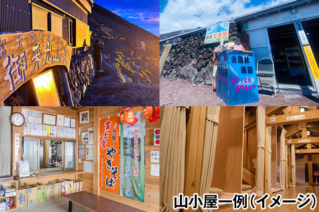 山小屋での仮眠は相部屋でのご利用となり、布団が用意されております。お風呂・シャワー・洗面はございません。山小屋には売店やトイレがあり、山小屋毎の焼印(有料)なども用意されています。着替え場所はございませんのでトイレなどをご利用いただきます。山小屋が山口山荘の場合は、夕食はお弁当のお渡しとなります。朝食の弁当は通常、山小屋に入った時にお渡しします。