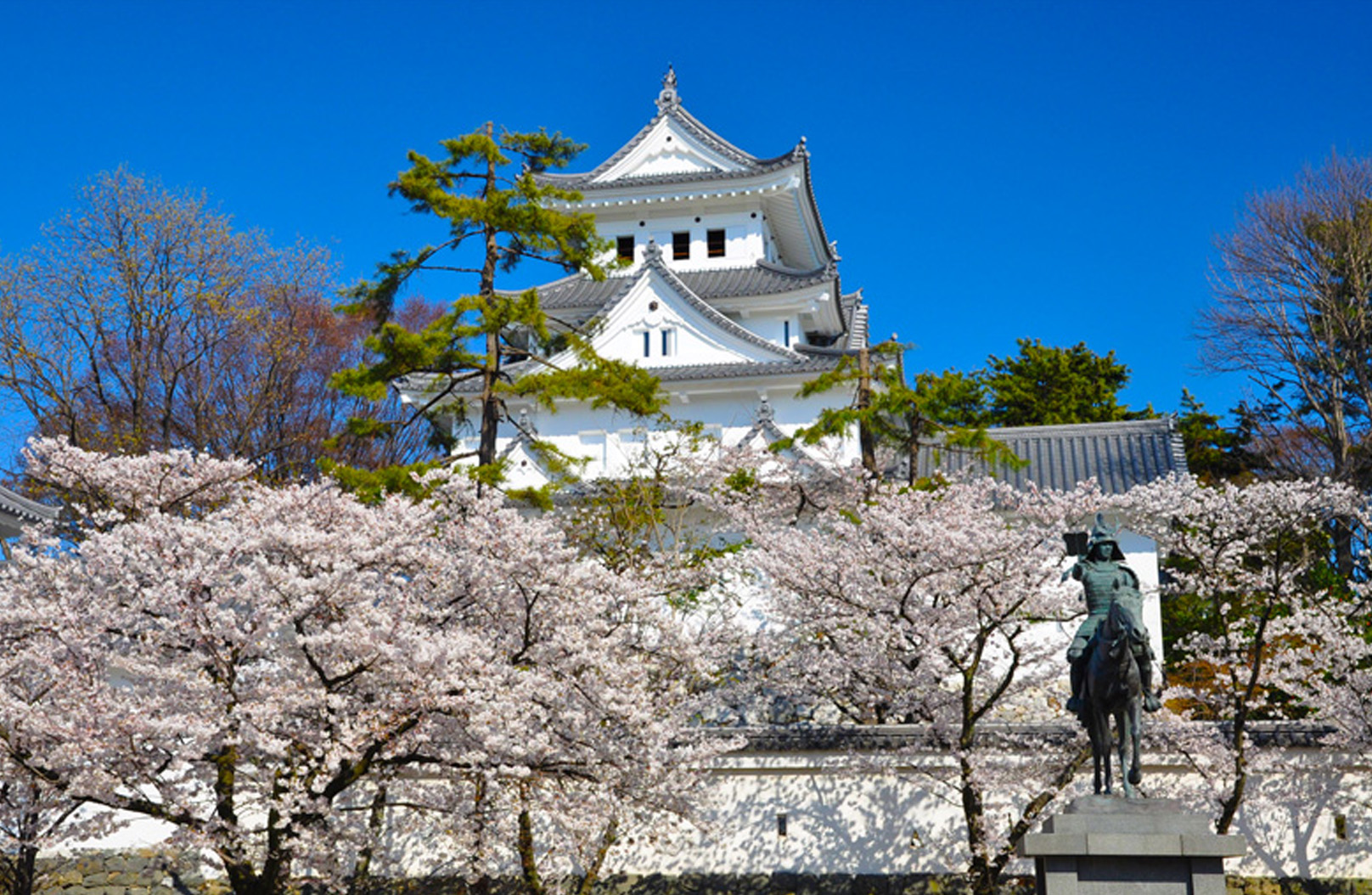 美濃守護・土岐一族の宮川吉左衛門尉安定により、1535年に創建されたと伝えられ、関ケ原の戦いでは、石田三成の本拠地となりました。1936年に国宝に指定されましたが、1945年7月戦災で焼失。1959年に4層4階の天守を再建し、城下町大垣のシンボルになりました。城がある大垣公園内には30種約200本の桜があり、岐阜県内でも人気の観桜スポットです。(例年の見頃:4月上旬)