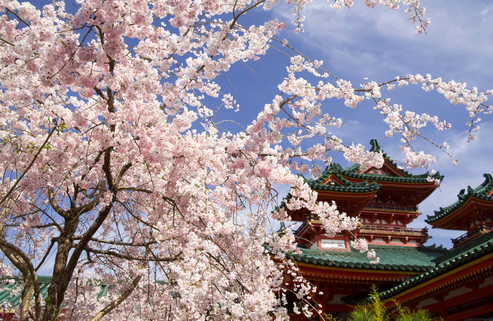平安遷都1100年を期に市民の総社として創建された平安神宮。その社殿を取り囲む4つの庭から構成される神苑は、京都でも指折りの広さと美しさを持つ明治期の代表的な日本庭園で国の名勝に指定されています。一面ピンク色に染まる庭園や朱塗りの社殿とのコントラスト、栖鳳池の水面に浮かぶ桜景色は必見です。