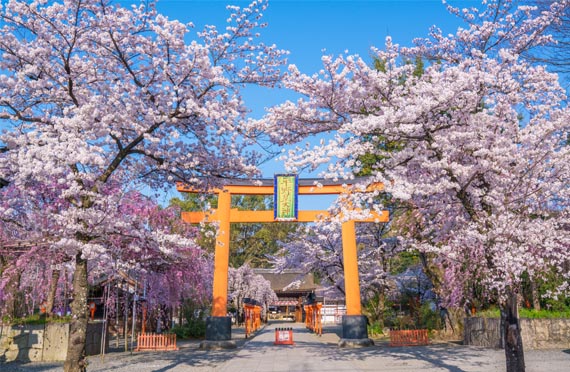 794年桓武天皇の命で大和国から遷座したのが始まりで、寛永年間に造られた現在の本殿は重要文化財に指定されています。平安時代から桜の名所として知られており、珍しい種類の桜が多く見られるのが特徴です。魁桜、寝覚桜、平野妹背、手弱女、突羽根など約60種類、400本の桜が咲き乱れます。