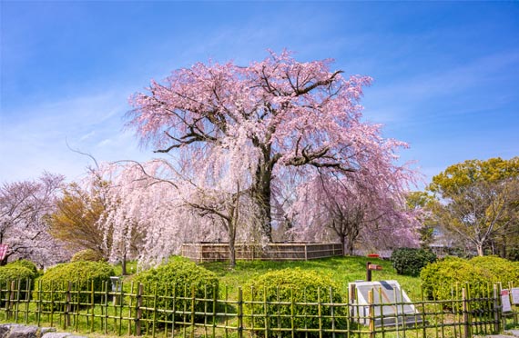 円山公園は京都市内最古の公園で、京都随一の桜の名所として古くから親しまれています。ソメイヨシノや、ヤマザクラなど約700本の桜が植えられており、特に園内中央の「祇園枝垂桜」が有名で京都の春の象徴的存在として知られています。この「祇園枝垂桜」は実は二代目で、初代は昭和22年に樹齢200年以上の天寿を全うし枯死しており、初代の種子から大事に育てられた木が現在二代目となっています。